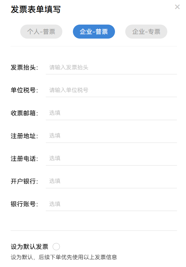 点击申请发票,并填写开票信息,即可对其中的部分或全部订单进行开票。