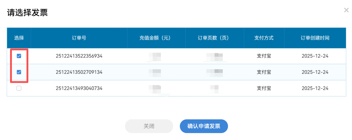 点击申请发票,并填写开票信息,即可对其中的部分或全部订单进行开票。